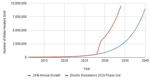 This chart from New Buildings Institute shows projected U.S. sales growth for heat pump water heaters through 2040. One line reflects steady 26 percent annual growth, while the other shows a faster increase driven by new federal efficiency standards. Under this scenario, heat pump water heaters could reach 50 percent of the national market by 2029, marking a major shift in how Americans heat their water.
