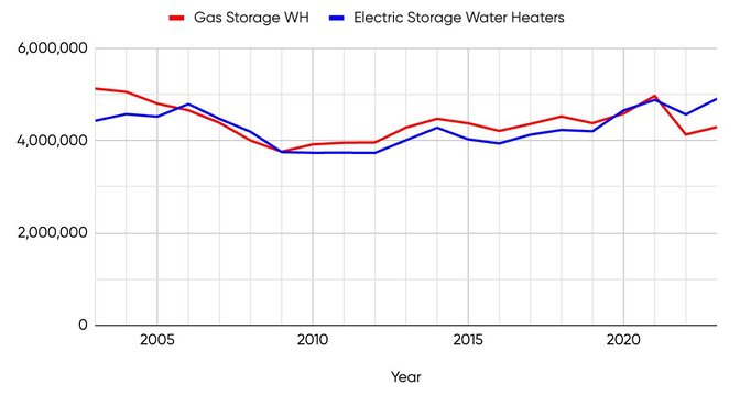 This chart from CleanTechnica compares annual U.S. sales of gas and electric water heaters, showing how heat pump water heaters are steadily gaining market share. Note that electric numbers include HPWHs.
