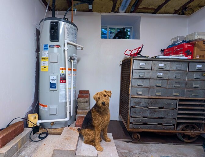 André’s new heat pump water heater, installed after his old gas unit failed, now provides steady hot water – and a curious basement companion, Enee, approves of the upgrade.